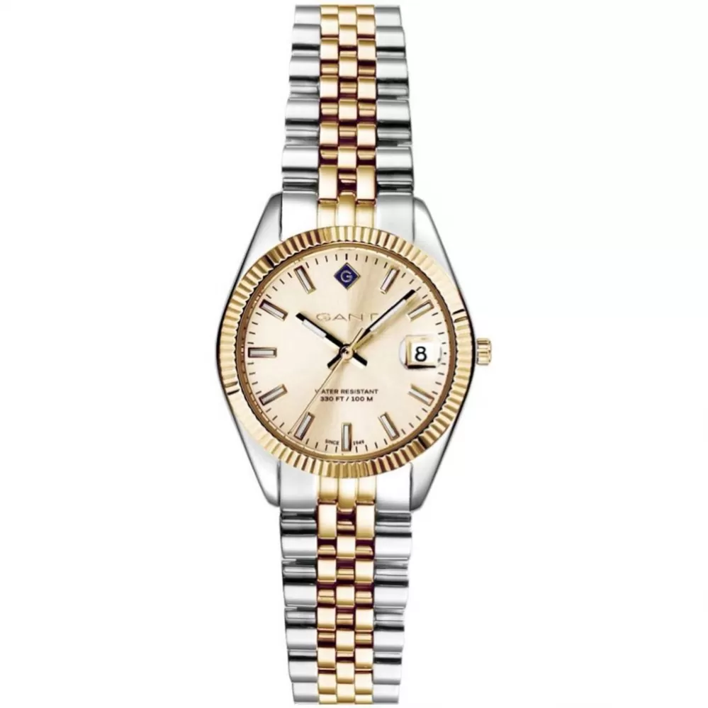 Decentní dámské náramkové hodinky Gant jsou navrženy tak, aby skvěle padly ženskému zápěstí. Hodinky jsou vyrobeny z vysoce kvalitní nerezové ocele. Kulaté pouzdro je vybaveno spolehlivým strojkem a baterií s dvouletou životností. Zlatý číselník má k dispozici jednoduché ručičky a indexy hodin. Na pozici třetí hodiny najdete datum. Hodinky jsou vhodné pro každodenní nošení i do společnosti.
