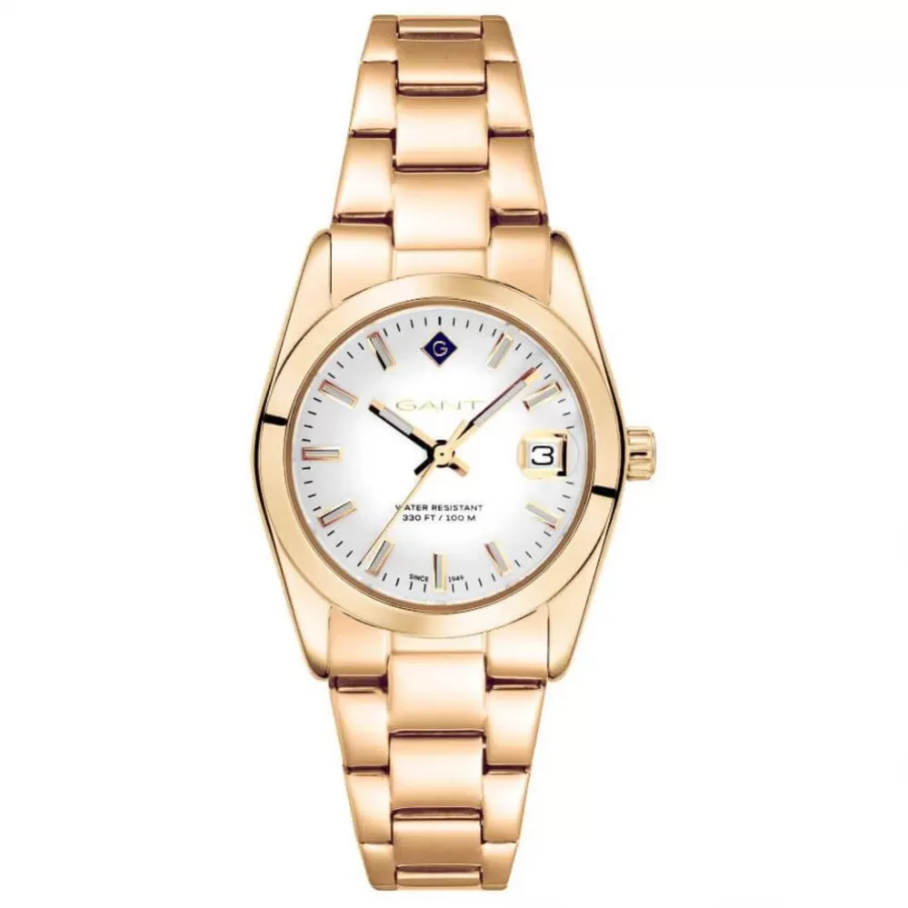 Decentní dámské náramkové hodinky Gant jsou navrženy tak, aby skvěle padly ženskému zápěstí. Hodinky jsou vyrobeny z vysoce kvalitní nerezové ocele. Ocel je ošetřena PVD povrchovou úpravou v barvě žlutého zlata. Kulaté pouzdro je vybaveno spolehlivým strojkem a baterií s dvouletou životností. Bílý číselník má k dispozici jednoduché ručičky a indexy hodin. Na pozici třetí hodiny najdete datum. Hodinky jsou vhodné pro každodenní nošení i do společnosti.