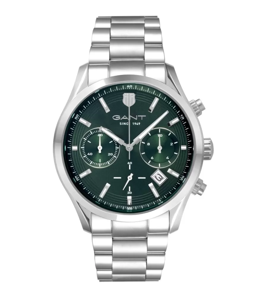 Gant P206004 jsou pánské hodinky ze serie Prestige s funkcí chronografu, vybavené vysokopřesným strojkem měřícím čas v sekundovém režimu. Pouzdro z broušené nerezové ocelo má průměr 43 mm a tloušťku 11 mm, což poskytuje robustní, ale stále elegantní vzhled. Ciferník je zelený, texturovaná, se stříbrnými luminiscenčními indexy a ručičkami pro snadné čtení i za horšího světla. Na pozici 4 a 5 hodinou se nachází datumovka, je zde také minutová stupnice a chronografické subčíselníky pro přesné měření časových úseků.