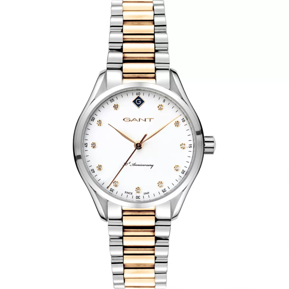 Moderní dámské hodinky GANT Sharon 39 G139001 v nerezovém provedení s částečným PVD zlacením. Hodinky zdobí přehledný stříbrný ciferník se zlatými indexy, které jsou navíc ozdobené zářivými kamínky. Tyto hodinky doplní Vaší kolekci hodinek o nádherný kousek. Vsaďte na tento model hodinek GANT.