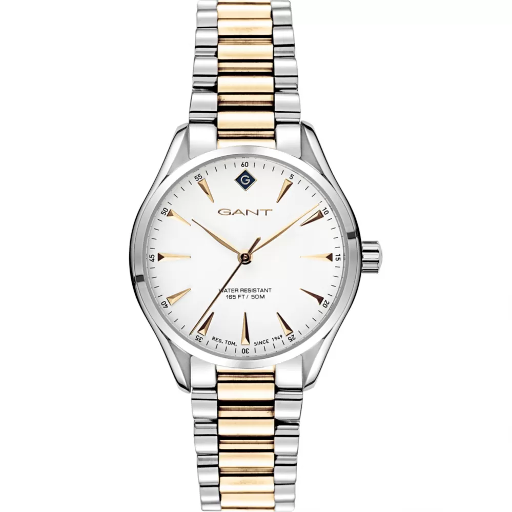 Moderní dámské hodinky GANT Sharon G129004 v nerezovém provedení s částečným PVD zlacením, které zdobí přehledný bílý ciferník se zlatými indexy. Tyto hodinky doplní Vaší kolekci hodinek o nádherný kousek. Vsaďte na tento model hodinek GANT.