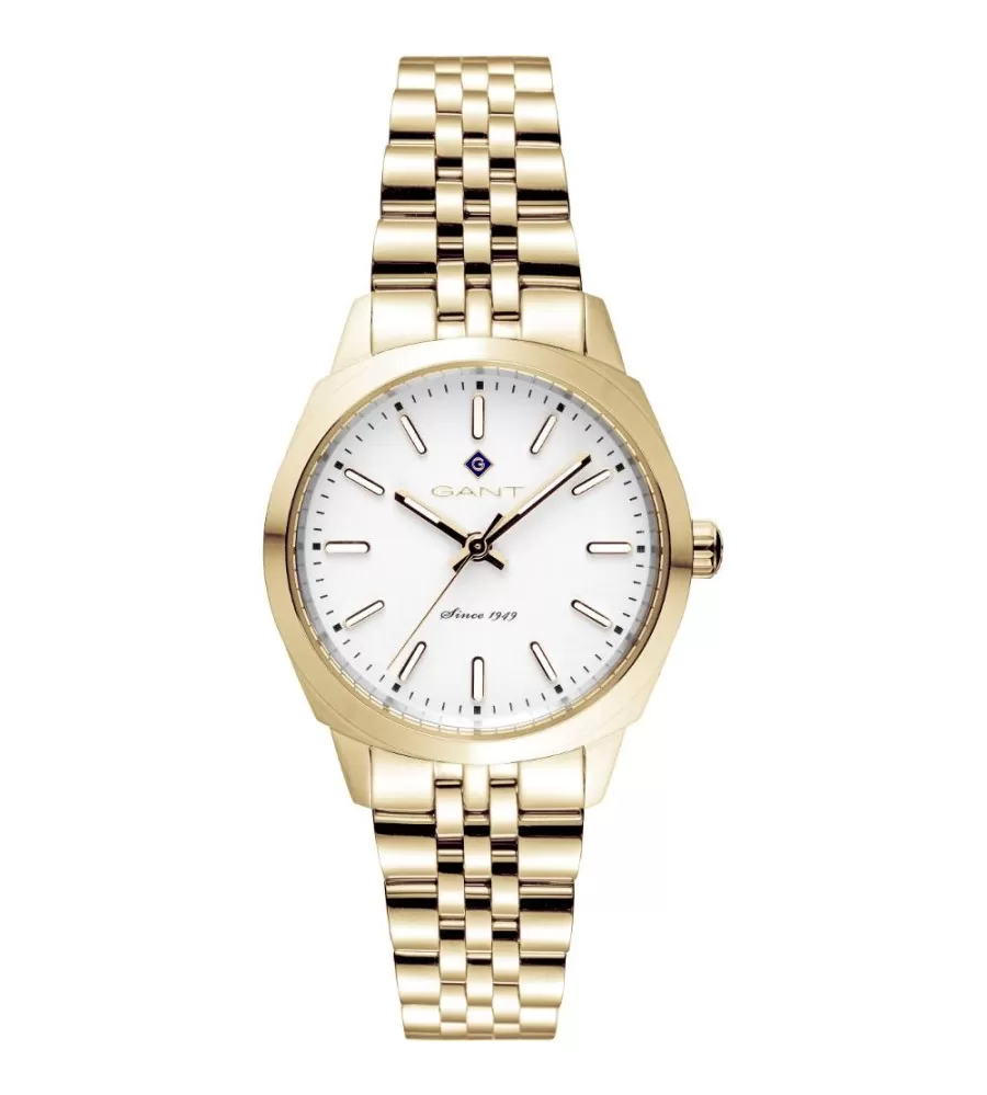 Dámské hodinky v sobě spojují nadčasovou eleganci a moderní styl. Jejich kulaté pouzdro o průměru 32 mm je vyrobeno z oceli s luxusní zlatou povrchovou úpravou, která dodává hodinkám sofistikovaný vzhled. Čistě bílý ciferník s jemnou strukturou je osazen zlatými ručičkami a indexy, což zajišťuje perfektní čitelnost a přidává na exkluzivitě modelu. Na pozici šesté hodiny se nachází nápis „Since 1949“, který odkazuje na tradici značky GANT. Minerální sklíčko chrání ciferník. Hodinky jsou poháněny precizním quartzovým strojkem, který zajišťuje přesné měření času. Elegantní zlatý ocelový tah s jemně tvarovanými články je nejen vizuálně atraktivní, ale také pohodlný na nošení. Hodinky Lauderdale jsou ideální volbou pro ženy, které hledají stylový a elegantní doplněk ke každodennímu i společenskému outfitu.