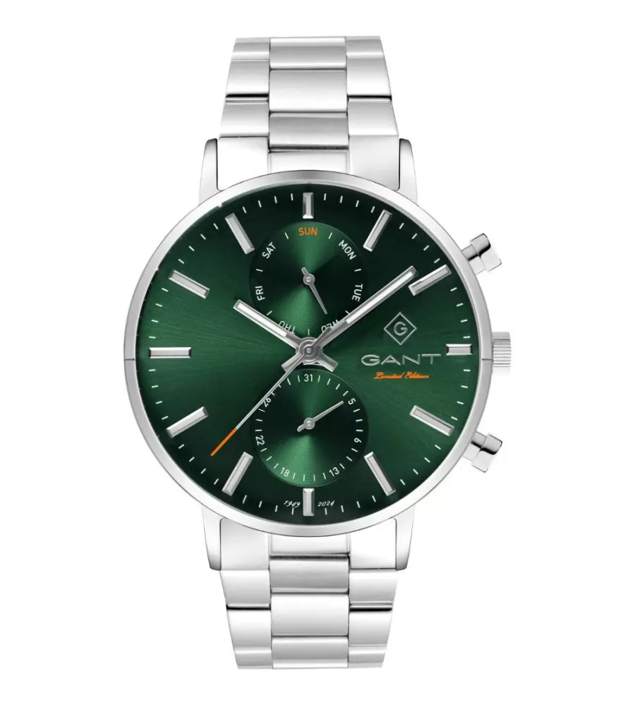 Pánské hodinky GANT Park Hill Day-Date II představují elegantní spojení klasického designu a moderní funkčnosti. Jejich pouzdro o průměru 43,5 mm a tloušťce 10 mm zajišťuje stylový vzhled. ​Zelený sunray ciferník je vybaven stříbrnými ručičkami a indexy, které zajišťují dobrou čitelnost. Hodinky disponují dvěma subciferníky: na pozici 12 hodin je ukazatel dne v týdnu a na pozici 6 hodin ukazatel data. ​Ocelový tah ladí s pouzdrem a dodává hodinkám jednotný vzhled. Hodinky jsou poháněny quartzovým strojkem, který zajišťuje přesné měření času. ​Model Park Hill Day-Date II je ideální volbou pro muže hledající stylový a funkční doplněk pro každodenní nošení i formální příležitosti.