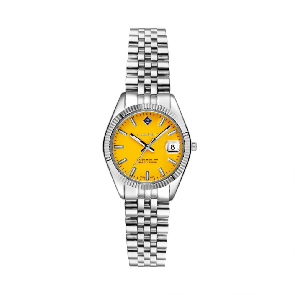 Decentní dámské náramkové hodinky Gant jsou navrženy tak, aby skvěle padly ženskému zápěstí. Hodinky jsou vyrobeny z vysoce kvalitní nerezové ocele. Kulaté pouzdro je vybaveno spolehlivým strojkem a baterií s dvouletou životností. Žlutý číselník má k dispozici jednoduché ručičky a indexy hodin. Na pozici třetí hodiny najdete datum. Hodinky jsou vhodné pro každodenní nošení i do společnosti.